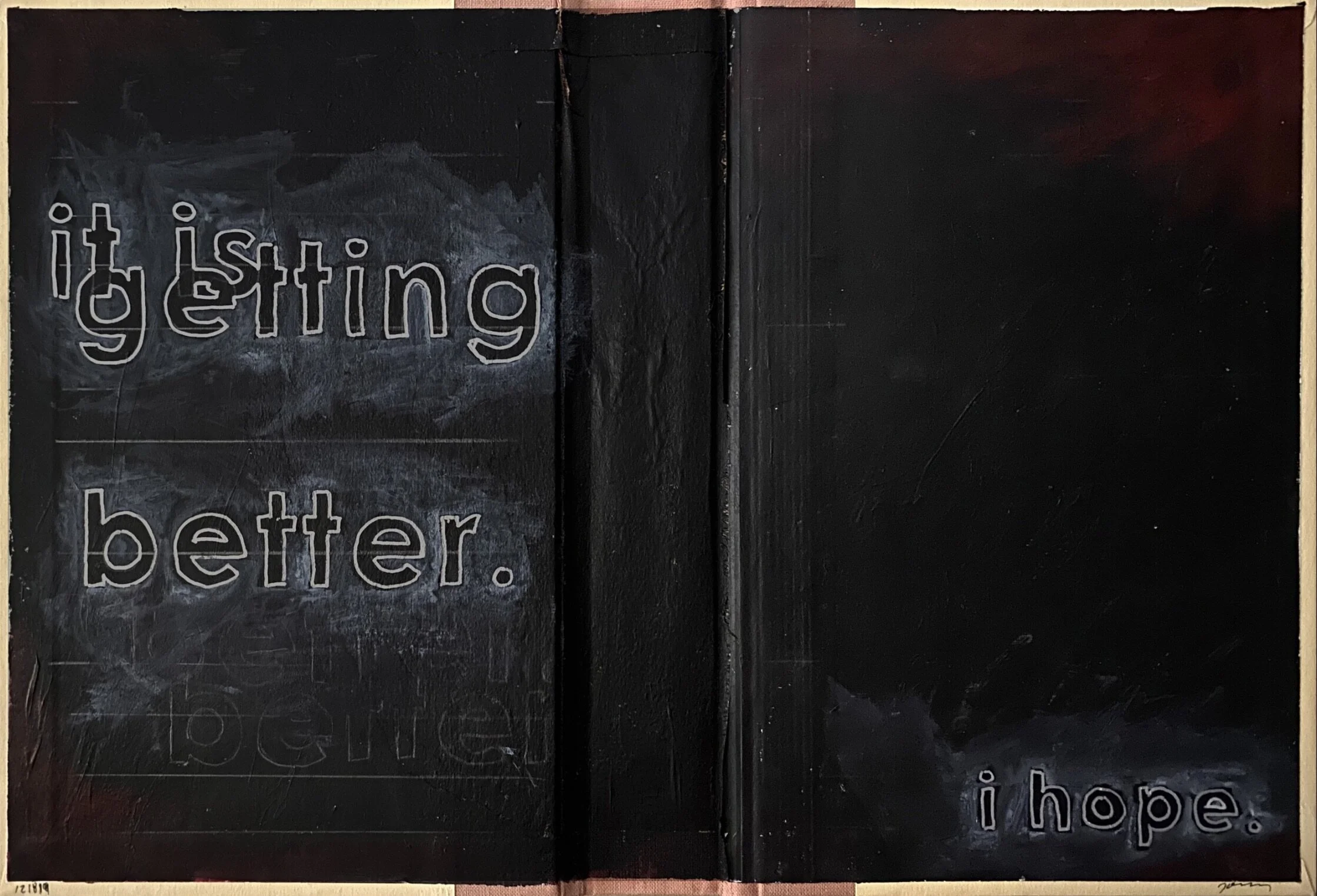 Jolly’s series can be seen as a collection of “self-portraits” marked by several internal monologues. Painted on the insides of old book covers salvaged from discarded Los Angeles Public Library books, these silent soliloquies offer a glimpse within — a look at the internal book cover of the mind, so to speak. The works touch on themes including love, anxiety, longing, self-doubt, and cautious optimism, while they also weave in observations of events occurring just beyond oneself. The painted backgrounds echo the sentiment conveyed in the words painted in each piece — with some of the backgrounds rather turbulent and expressionist in style, and other calm and placid.
