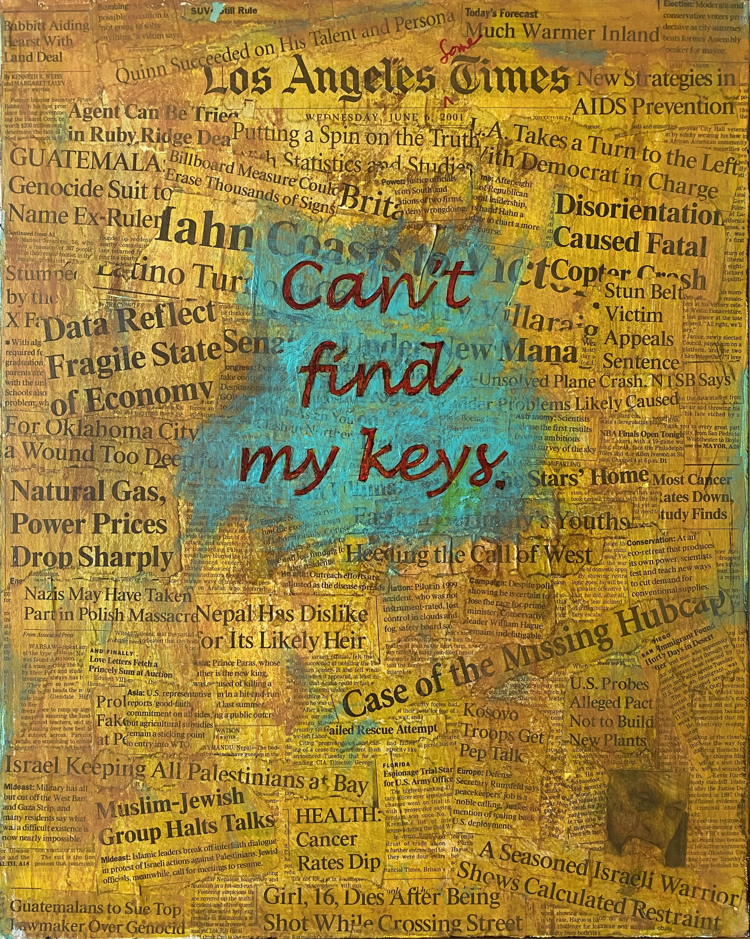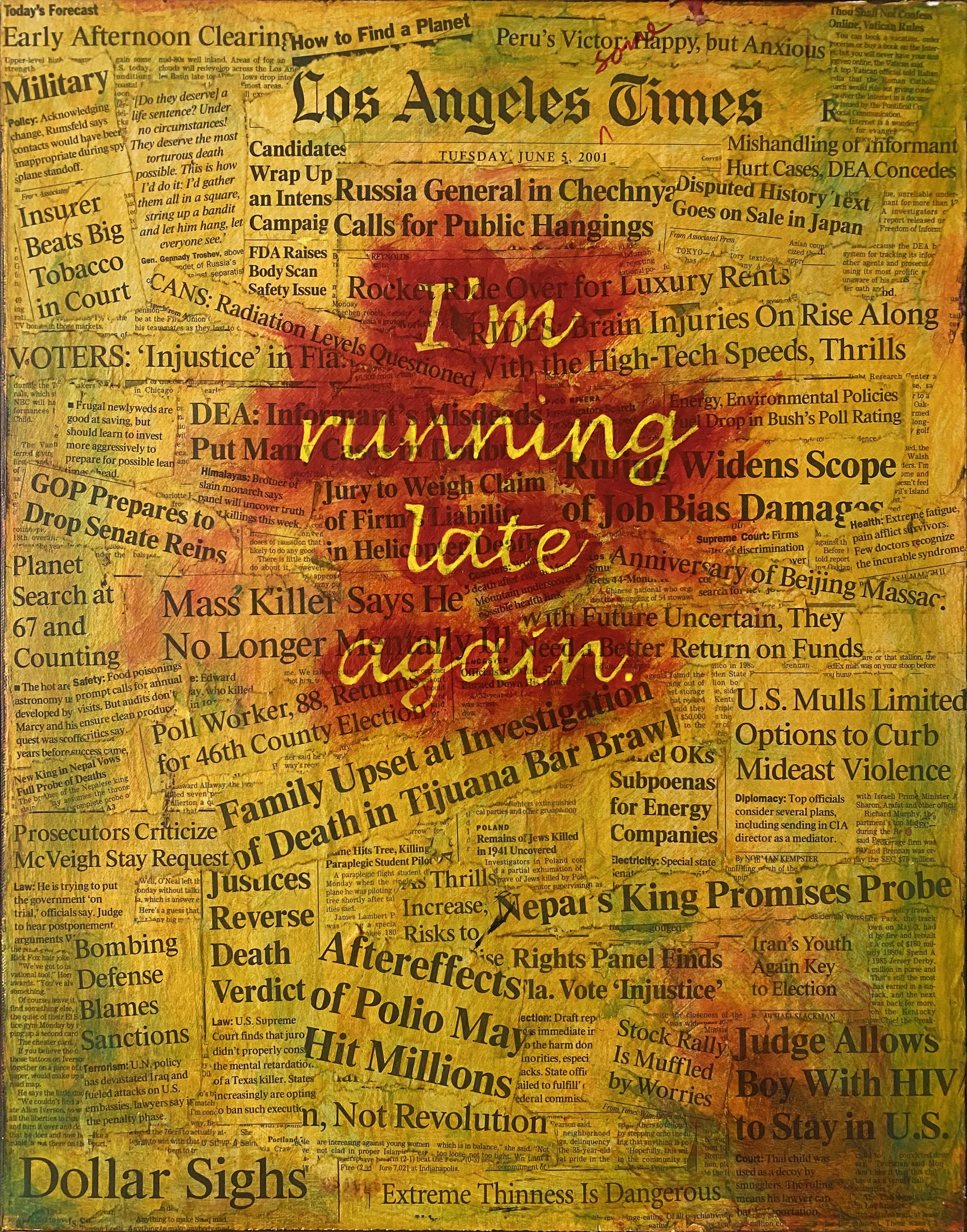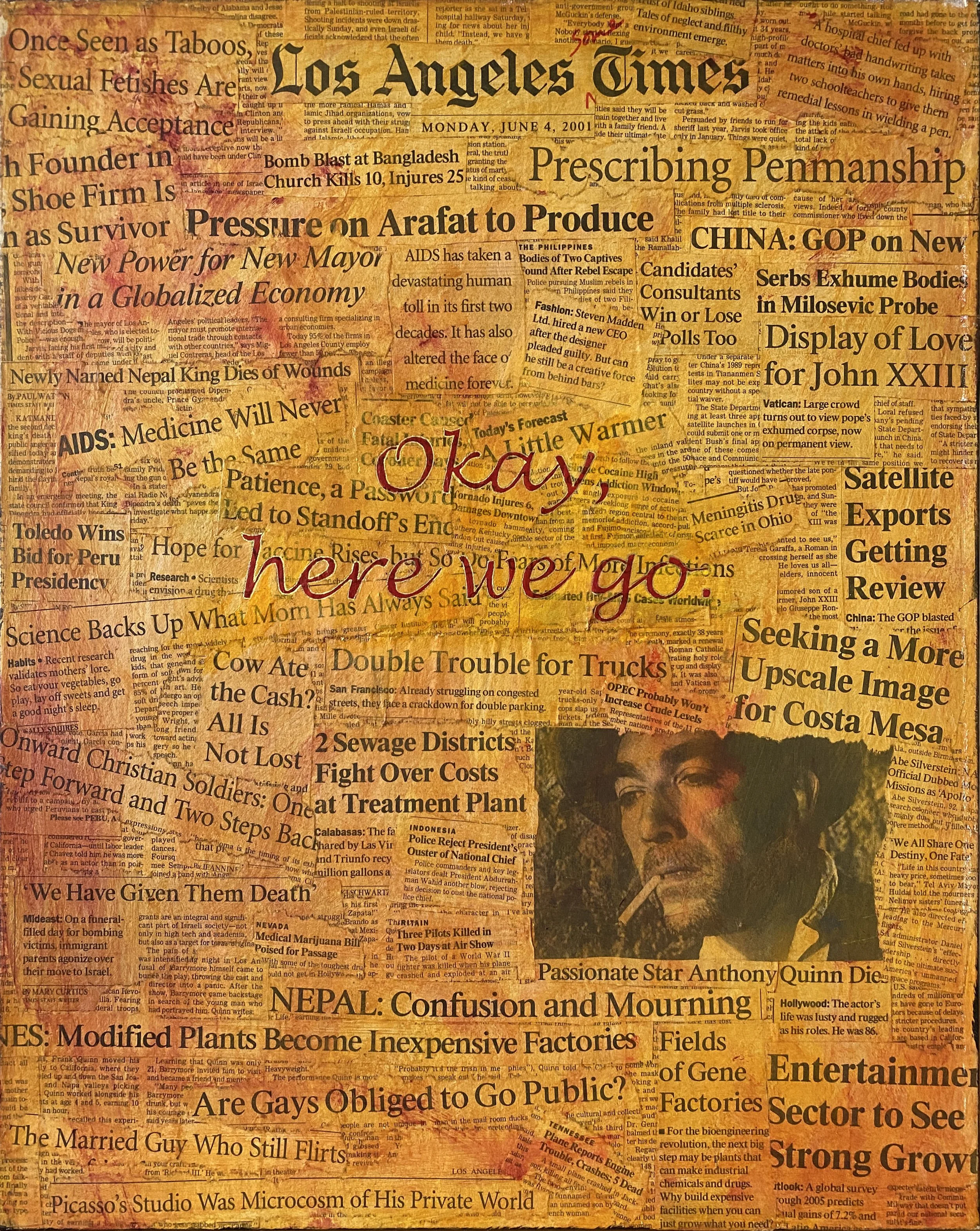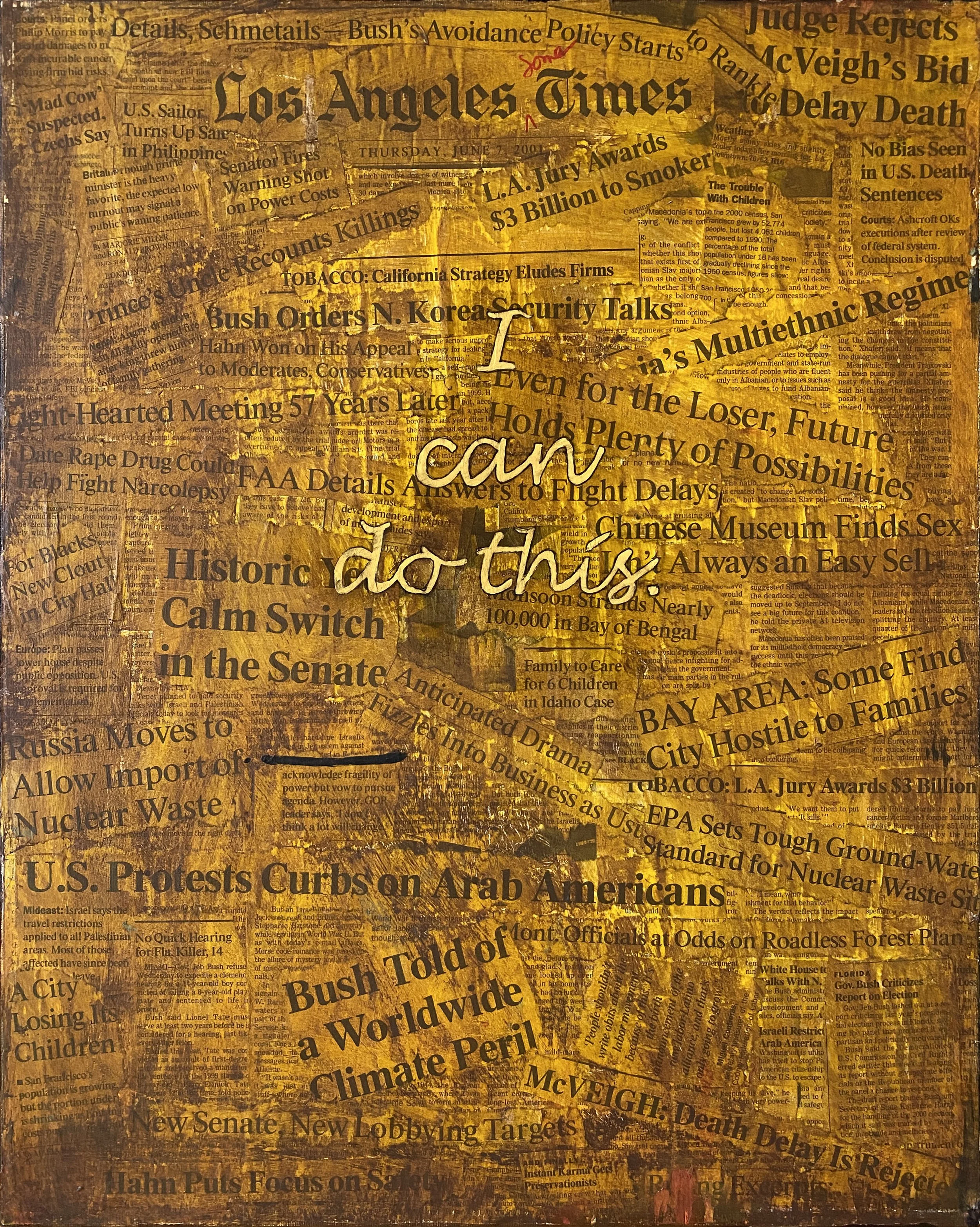 2 weeks of headlines juxtaposed with inner thoughts, separated by 21 years - collage on canvas and paper